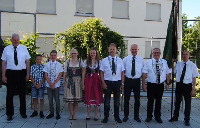 Von rechts: Fahnenträger Markus Dehler, Schützenkönig KK-Gewehr Schützenmeister Klaus Grasser, sein Vize Herbert Saam, er ist gleichzeitig auch Vize mit der Sportpistole, neben ihm der König Sportpistole, Andreas Koch, dann Damenklasse Luftgewehr Christina Erl, ihre Vizekönigin Sophia Schmitt, dann Schützenkönig Jugendklasse Luftgewehr Ben Schnitzerlein mit Seinem Vize Max Schmeußer und links außen 1. Vorstand Volkmar Bürger