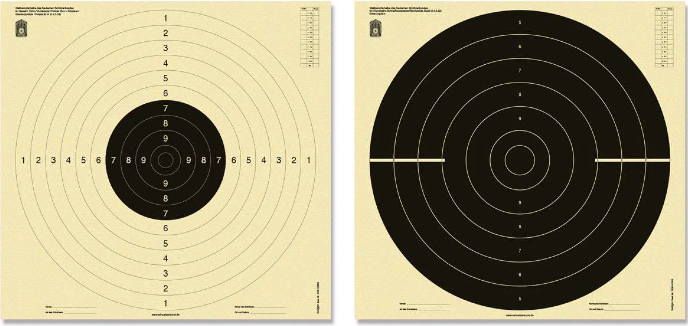 | Präzisionsschießen: Es werden sechs Serien à fünf Schuss in je fünf Minuten abgegeben. Duellschießen: Es werden sechs Serien à fünf Schuss abgegeben, bei denen die Scheiben dem Schützen jeweils nur drei Sekunden zugedreht und sieben Sekunden weggedreht sind. Die Rundenwettkämpfe werden i. d. R. nur im halben Umfang durchgeführt, d. h. jeweils nur fünfzehn Schuss in jedem Durchgang. Eine Mannschaft besteht immer aus vier Schützen. Es werden in den beiden Durchgängen unterschiedliche Scheiben verwendet. |